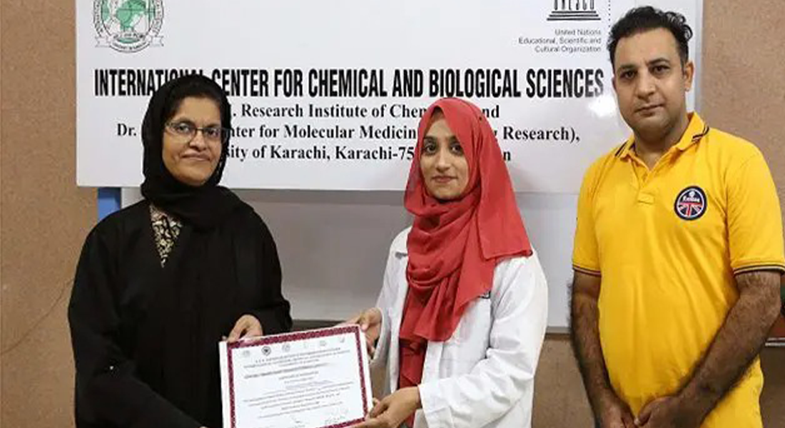 ایچ ای جے ریسرچ انسٹی ٹیوٹ آف کیمسٹری، جامعہ کراچی کی ایک پی ایچ ڈی طالبہ سنعیہ خورشید نے 28 ممالک کے اسکالرز میں پہلی پوزیشن حاصل کی