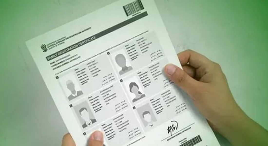 نیشنل ڈیٹابیس رجسٹریشن اتھارٹی (نادرا) فیملی رجسٹریشن سرٹیفکیٹ (ایف آر سی) جاری کرنے کی مجاز اتھارٹی ہے۔ یہ اہم دستاویز ہے جس میں ایک خاندان کے مکمل افراد کی تفصیلات موجود ہوتی ہیں۔