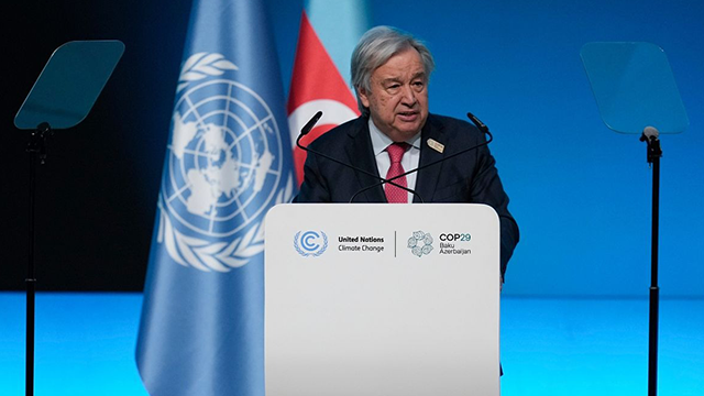 عالمی رہنماؤں سے اپنے خطاب میں انتونیو گوتریس نے کہا 2024 آب و ہوا کی تباہی کی ایک ماسٹر کلاس ہے، اگلے سمندری طوفان سے پہلے اپنی جان بچانے کے لیے بھاگنے والے خاندان؛ کارکنان اور زائرین ناقابل برداشت گرمی کا شکار ہو رہے ہیں، سیلاب انفراسٹرکچر کو تباہ کر دیتا ہے۔ انھوں نے کہا ’’بچے بھوکے سو رہے ہیں کیوں کہ فصلیں خشک سالی کی وجہ سے تباہ ہو رہی ہیں، یہ تمام آفات اور تباہیاں محض انسان کے ہاتھوں لائی گئی موسمی تبدیلیوں کی وجہ سے رونما ہو رہی ہیں۔
