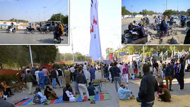 کامران چورنگی سے موسمیات آنے جانے والا روڈ ٹریفک کے لیے مکمل بند ہےجس کا متبادل راستہ ایک روڈ پر دھرنے کے شرکاء بیٹھے ہوئے ہیں دوسرے روڈ پر ٹریفک کو ڈبل چلا رہے ہیں۔