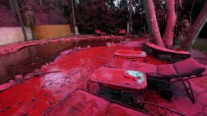 غیرملکی میڈیا کے مطابق لاس اینجلس میں گھروں اور عمارتوں کی چھتوں، گاڑیوں اور سڑکوں پر ہر طرف ایک چمکدار گلابی پاؤڈر دیکھا جارہا ہے۔ اس گلابی پاؤڈر کو جہازوں کے ذریعے ان جگہوں پر پھینکا جارہا ہے، اس مادّے کو آگ سے نمٹنے کے لیے پھینکا جاتا ہے۔ حکام نے تصدیق کی ہے کہ آگ کے شعلوں کو مزید پھیلنے سے روکنے کے لیے اس پاؤڈر کے ہزاروں گیلن پچھلے ایک ہفتے میں استعمال کیے گئے ہیں۔