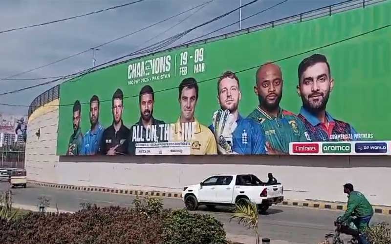 قاسم عمر فلائی اوور کی دیوار پر چیمپینز ٹرافی بورڈ لگا دیا گیا ہے جس پر تمام 8 کپتانوں کی تصاویر آویزاں کی گئی ہیں۔ اس کے علاوہ مختلف مقامات پر اسکرینز لگائی جائیں گی۔