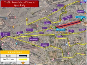 کراچی میں کل 28 مارچ کو بعد نماز جمعہ ایک دینی جماعت کی جانب سے “یوم القدس ریلی” نمائش سے تبت سینٹر تک نکالی جائے گی۔ ترجمان ٹریفک پولیس نے کہا ہے کہ ریلی کی وجہ سے ایم اے جناح روڈ کے بجائے متبادل روٹ کا انتخاب کریں تاکہ اپنی منزل مقصود پر باآسانی پہنچ سکیں۔