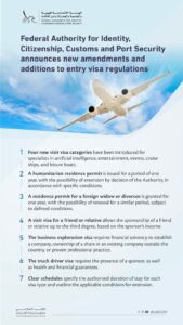 یہ اعلان فیڈرل اتھارٹی فار آئیڈنٹیٹی، سٹیزن شپ، کسٹمز اینڈ پورٹ سیکیورٹی ۔۔۔ کی جانب سے کیا گیا ہے۔ حکام کے مطابق یہ اقدام امارات کی اوپن پالیسی اور عالمی ٹیلنٹ، انوویٹرز، انٹرپرینیورز اور ٹورسٹس کو متوجہ کرنے کی حکمت عملی کا حصہ ہے۔